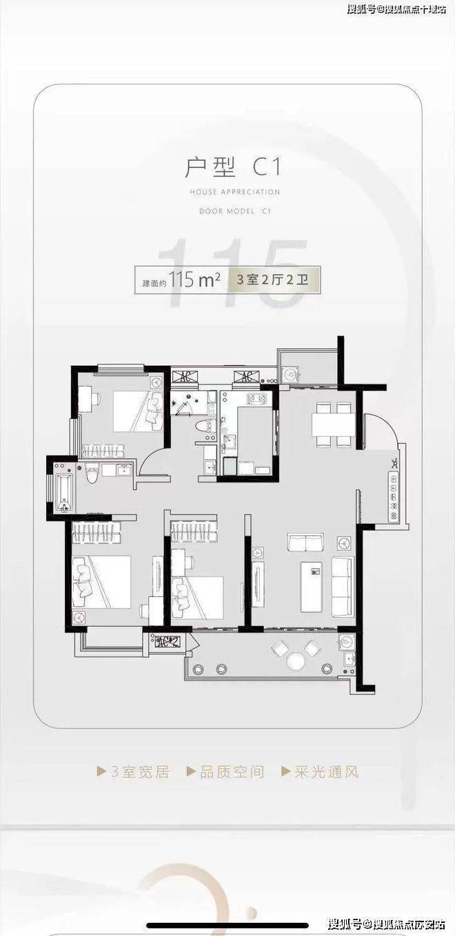 115㎡阳光户型,以三面采光格局,让每一个卧室以及客厅都能充分享受阳光的宠爱,打造人与阳光相处和谐的光环境生活家。整体户型270度的采光面,更带来通透舒畅的布局,冬日暖阳,夏天畅风,奢享健康生活。