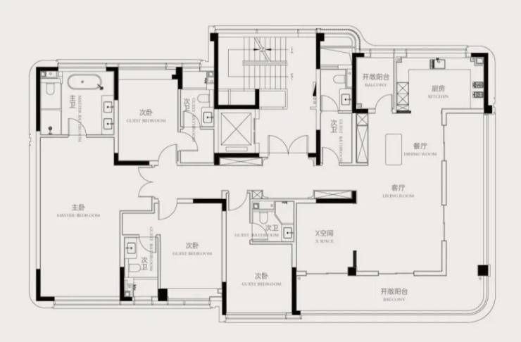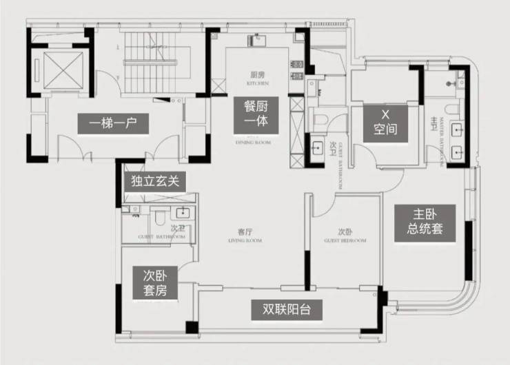 户型本身亮点很多。比如南向开间达22.4米,五开间朝南,采光面充足。公区采用了经典的LDKG设计,餐客厅面积约66㎡,敞亮奢阔。客厅旁边还有一个X百变空间,可做房间,也可拆除墙体进一步增加客厅尺度感。