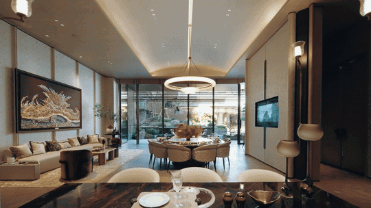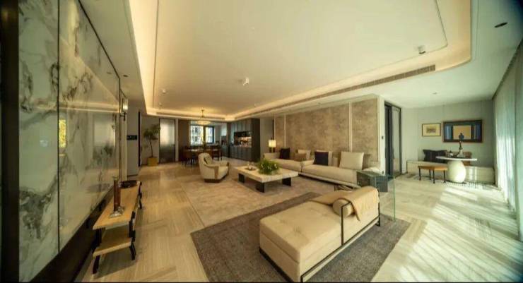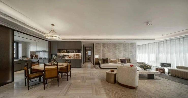 客餐厅以LDKB一体化设计,打造近50㎡的IMAX级社交型公区,天然石材密拼通铺,空间通透流畅,家人互动无间。