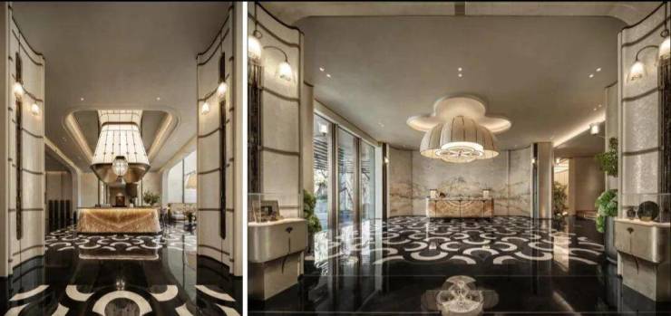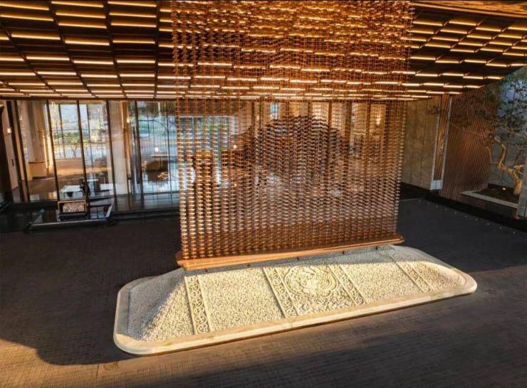 门头部分采用一道极其重工的6米宽冕旒垂帘,以6045颗景泰蓝珠纯手工串联,随光线流转如同帝王礼冠一样华贵,大门材质并搭配“不锈钢屋檐瓦、像景墙的库班绿石材、底座的威尼斯棕大理石;地面的福鼎黑+万年青石材;墙面的景泰蓝石材壁灯;仿铜色的镁锰金属屋顶……都是老钱风专属。
