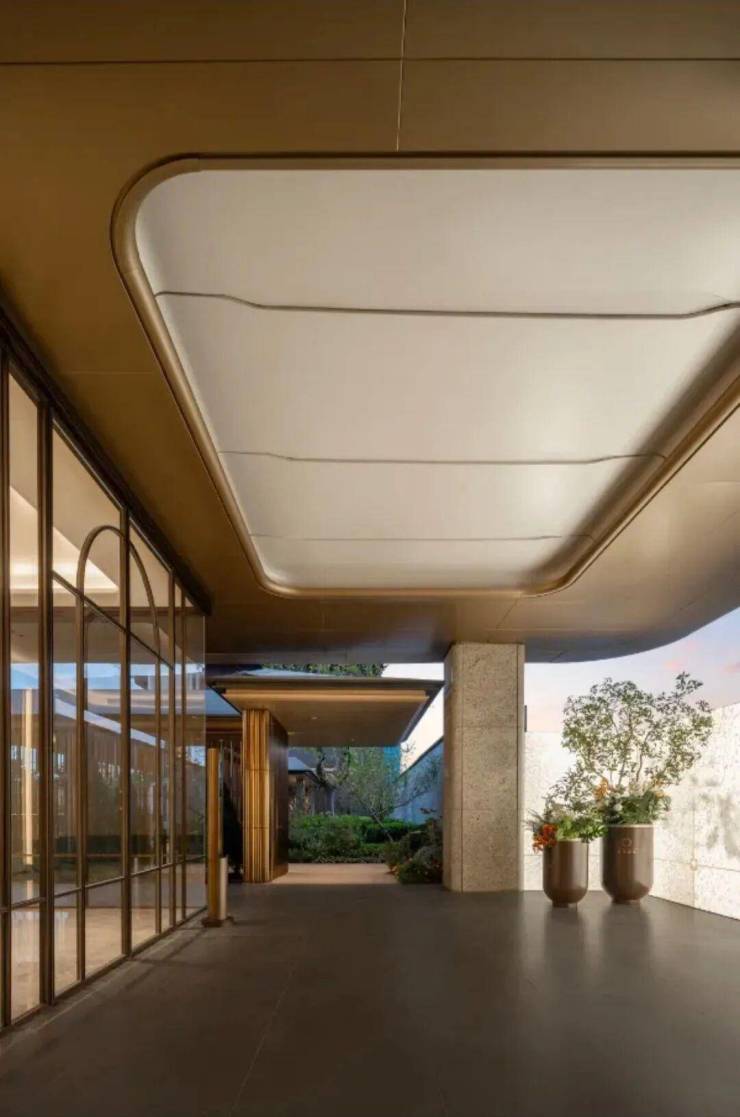 大门整体其设计灵感源自周代礼器“冕旒”,帝王冠冕垂珠的至高仪制,运用现代建筑语汇,构筑约85米长的"凤起冕旒"华贵门仪。经绿城的现代转译,升华为迎接时代精英的“精神冠冕”。
