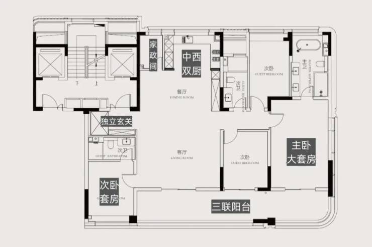 这款产品每一层只有一户,属于真正的一梯一户一层户型。户型设计为5房2厅5卫的格局,入户门是市面上少见的大尺度双开门。另外,主卧采用的也是双开门,这也是顶豪才有的配置。