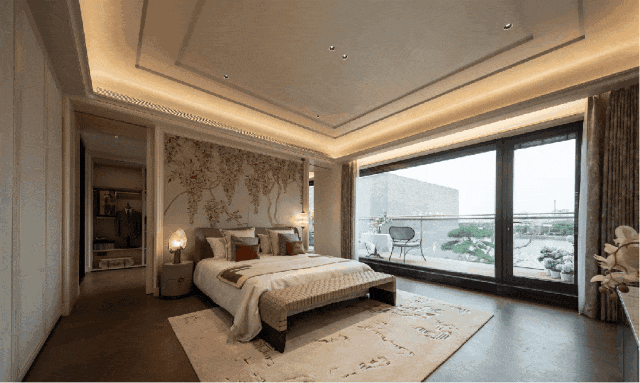 双南向套房设计,主卧堪称酒店式总统套房,270°环幕飘窗将视野与采光推向极致,步入式衣帽间动线考究。