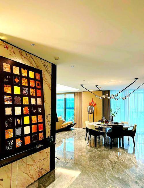 约450㎡“香奈儿”西边套,将原本多见于餐桌和墙面的白金沙奢石,漫铺于双厅地面之上。浅淡得宜的洁白,温润如玉的蜜色,将空间衬得时髦优雅。能眺望钱江两岸的梦幻天际线,“宇宙中心”奥体尽收眼底,也能俯瞰城市霓虹,车水马龙就在脚下。整个中心的璀璨世界定格在落地窗前,像一张巨幅明信片。