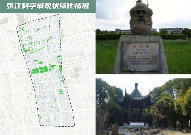 张江现状缺少绿化,园绿地数量少、分布不均,绿地游憩功能不足,大多为沿河、沿路的防护林地和,空间开放性、活动性不足,公园区附属绿地未予开放。
