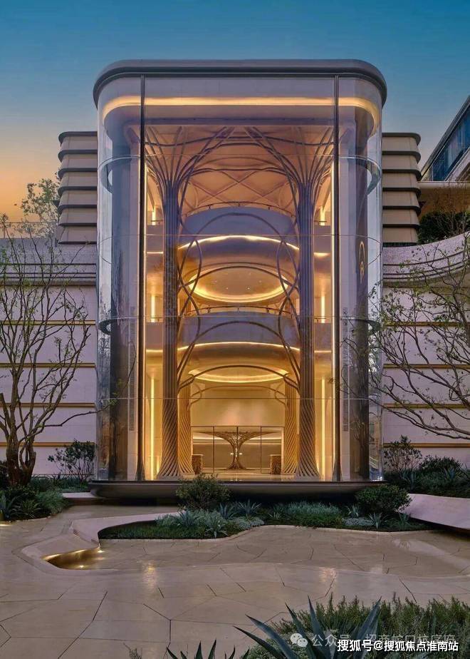 【生辉之金】:香槟金金属流线、手工密拼弧形金属板,外立面石材铝板采用干挂工艺,流动恒久的华贵。