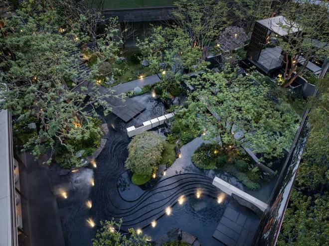 凭借约14米天然高差,以突破性的立体营造手法,将山川、溪谷、林泉的意象层层织就。近2000㎡实景下沉庭院,在都市中央展开一幅可游、可赏、可居的立体山水长卷,三境九韵至此呈现,东方美学步入全新表达维度。