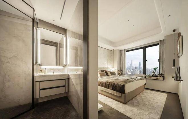 主卧套房中,非遗云纹立体墙布嵌入皮革背景,顶级爵士白奢材,艺术玻璃夹丝柜门,书香门第实木地板以回形纹路延伸雅致。主卫空间以鱼肚灰大理石与博雅白台面精工对拼,防水防潮皮革,香奈儿灰与星耀灰石材拼花地面,升级独立浴缸与尺度双台盆,营造艺术馆般的奢享境界。