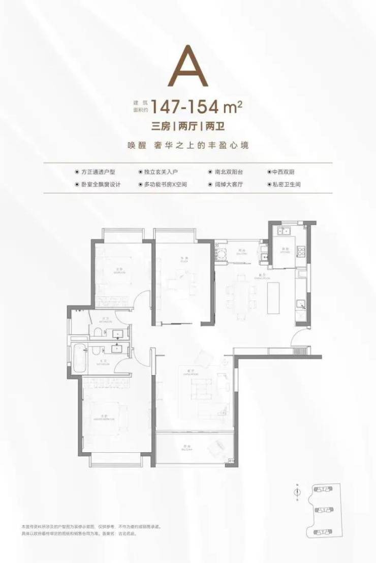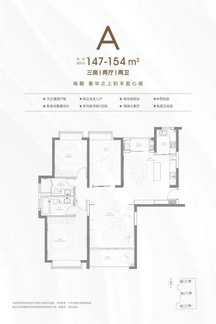 这次供应的主力户型是3个,一个是约150、154㎡左右的大三房两卫;另一个则是134㎡的3房两卫的中间套,在户型图上可能看不出,这个3房的尺度感非常惊人。