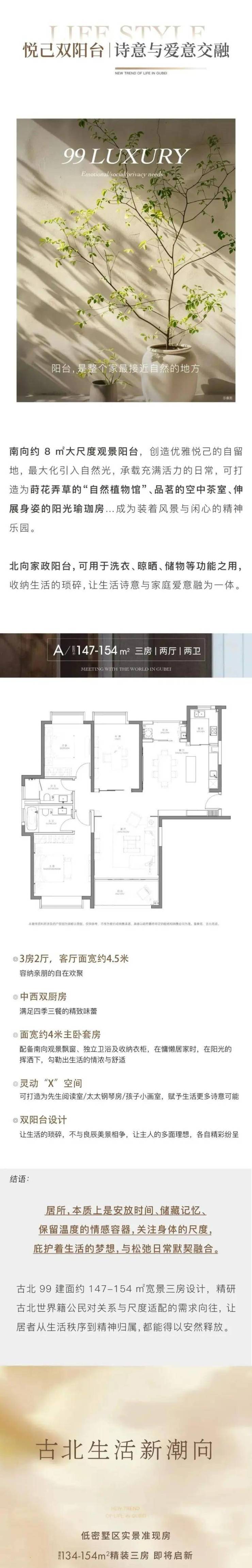 【古北99】由平层和联排别墅组成,建面约133-154㎡精装平层,&建面约300/419㎡联排别墅。高层总高15-19层,层高3.015米,133㎡两房,150-154㎡三房, 顶复237-299㎡;