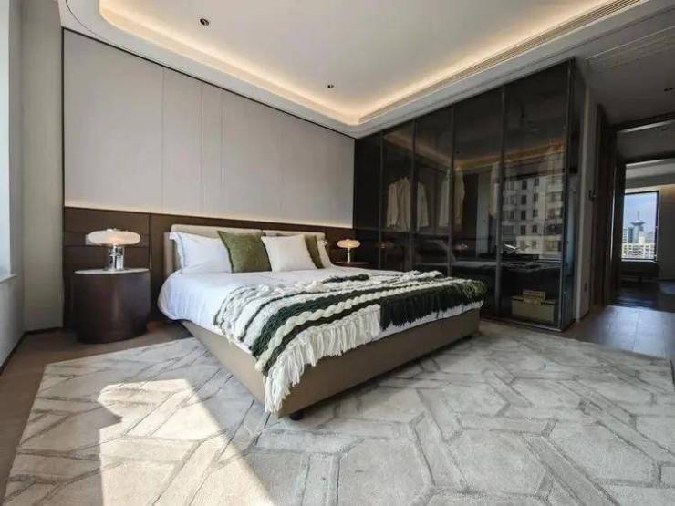 主卧的面宽也足够大,达到了4米,带来非常好的采光面和空间感,可以看到床尾还有非常阔绰的空间。并带有一个套房的功能