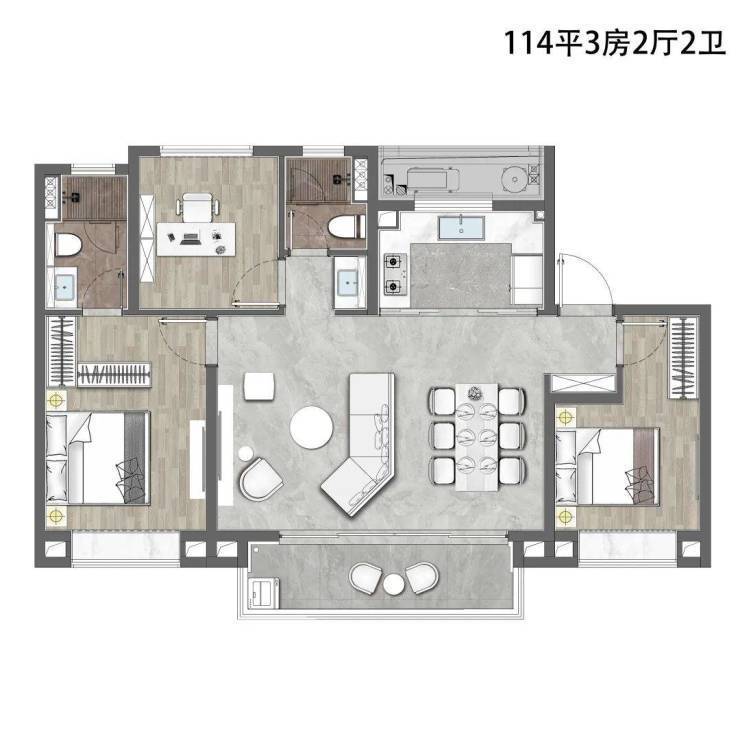 建面约114㎡户型是洋房产品,采光更好,垂直住户少,更清净,居住体验&舒适度更高。该户型做到了 三开间朝南+超大面宽横厅+主卧套房设计+卫生间干湿分离+南北通透 ,功能性和尺度感完美结合。