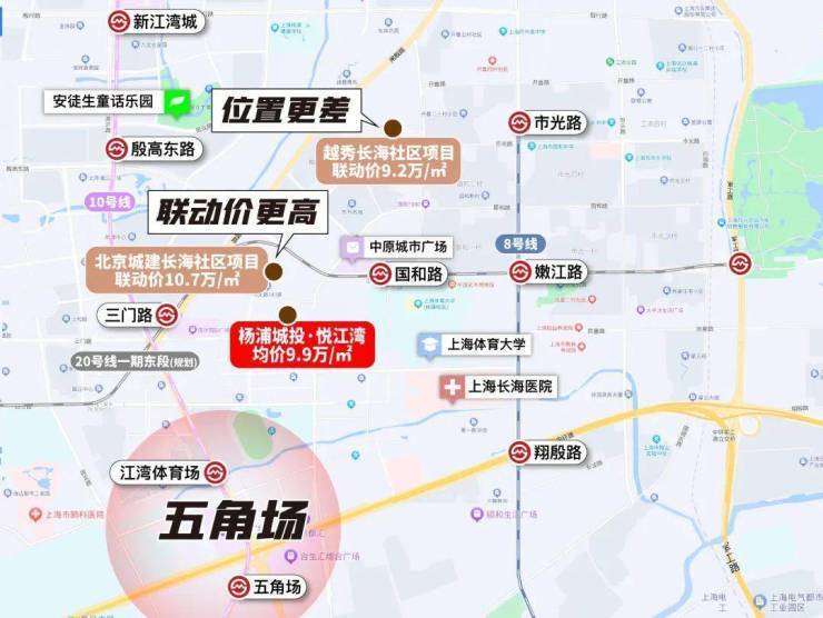 去年二批次土拍杨浦长海地块,联动价大涨!联动价突破了10W+,来到了10.7万/m²!比南侧400米的杨浦城投·悦江湾贵了8000元/㎡! 中环旁双轨交+新江湾+五角场的【杨浦城投·悦江湾】成最大赢家!