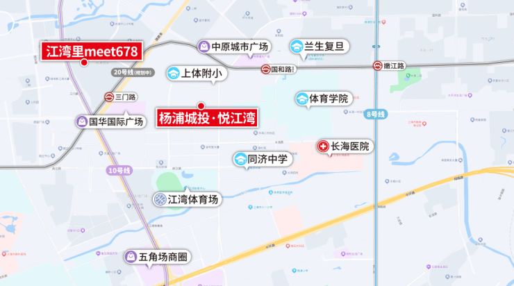 项目2公里半径覆盖有丰富的业态,配套包括 国华广场、中原城市广场、江湾里meet678 等商业, 长海医院、东方肝胆外科医院、肺科医院 等三甲医院。