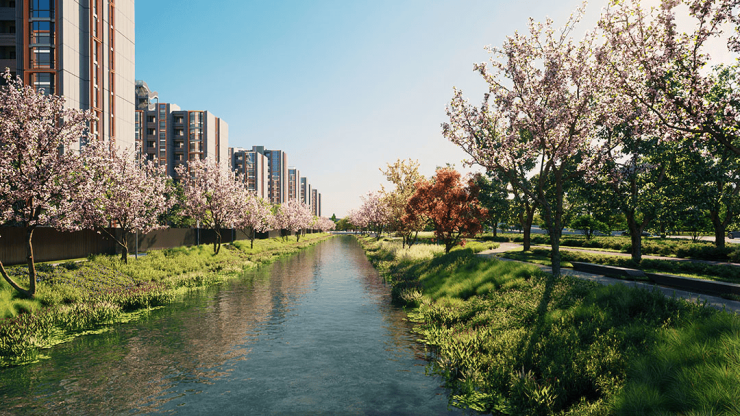 未来口袋公园、亲水平台、滨水步道等相互连接,不仅是城市绿肺,更是全龄活力社交场,将自然景观与运动、亲子、社交功能深度融合。