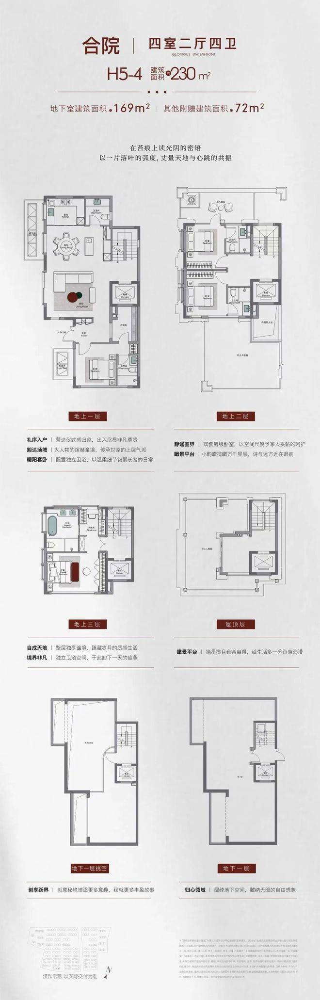 建面约 170㎡双拼别墅:6+1 房灵动格局,实际使用面积约 330㎡,附赠 70-120㎡私家花园与水岸空间,一楼层高 4.5 米,其他楼层层高 3.6 米,全明套房设计,满足三代同堂舒适居住。