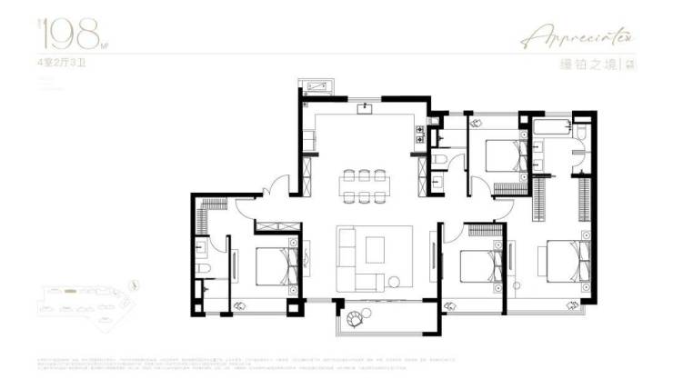 当传统百平户型还在为三开间挣扎,南山璞缦建面约198㎡以约19米四开间朝南面宽+LDKB一体化纵深实现降维打击。主卧折角飘窗延展空中墅级视野,HWCD团队更将海派摩登融入奢装细节,让室内每一寸空间成为艺术展场。