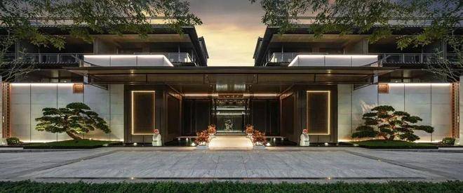 三重屋檐,代表天地人融合的东方宫殿最高等级,上檐、外檐、下檐三重结构,现代立面,以铝板、格栅、石材、瓦墙型材、玻璃等现代型材,彰显传世之宅的独特气度。