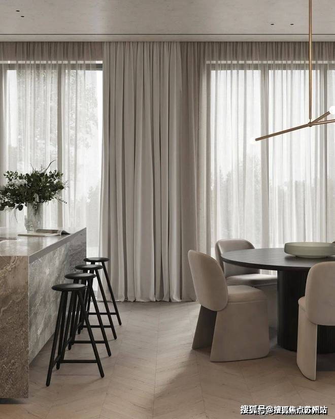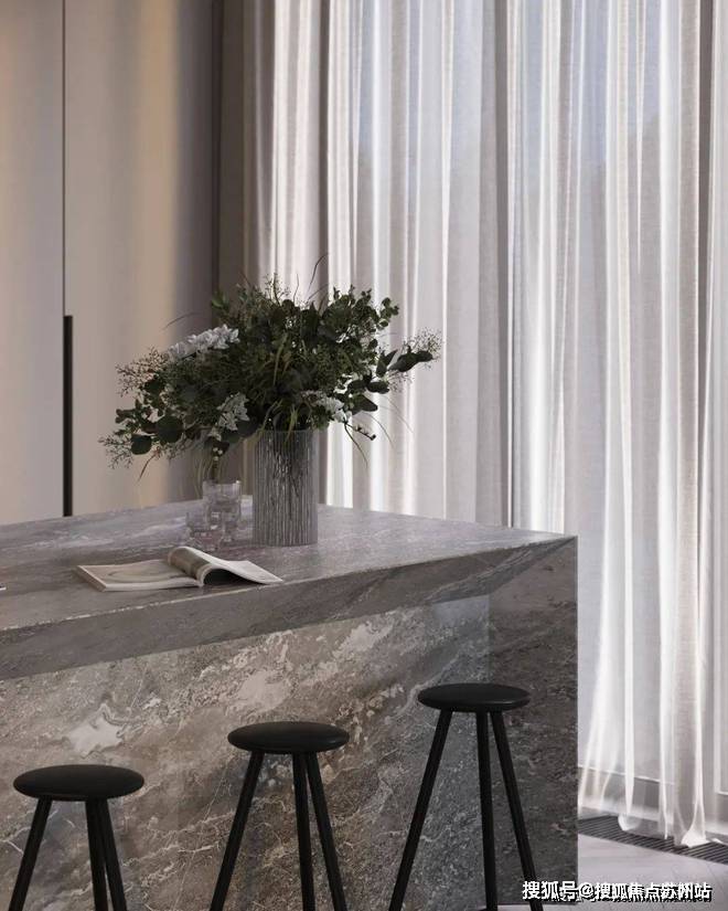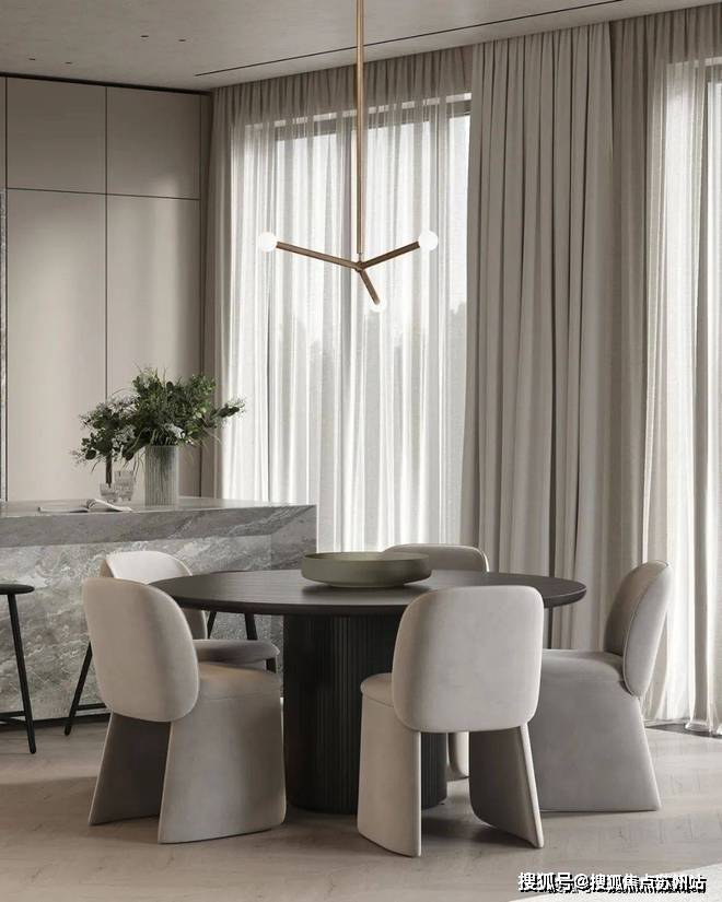 苏州上华璟庭售楼处电话☎:400-8118-224(售楼处预约看房热线)餐厅与厨房位于客厅的旁边,开放式的设计很好地利用了不大的公共空间,给人开阔的视觉感受.光线透过落地窗照入室内,让空间更加明亮.木质的圆形餐桌搭配上上方的金属吊灯,显得柔和而有质感.中岛台选用灰色大理石材质,与整体空间完美融合.