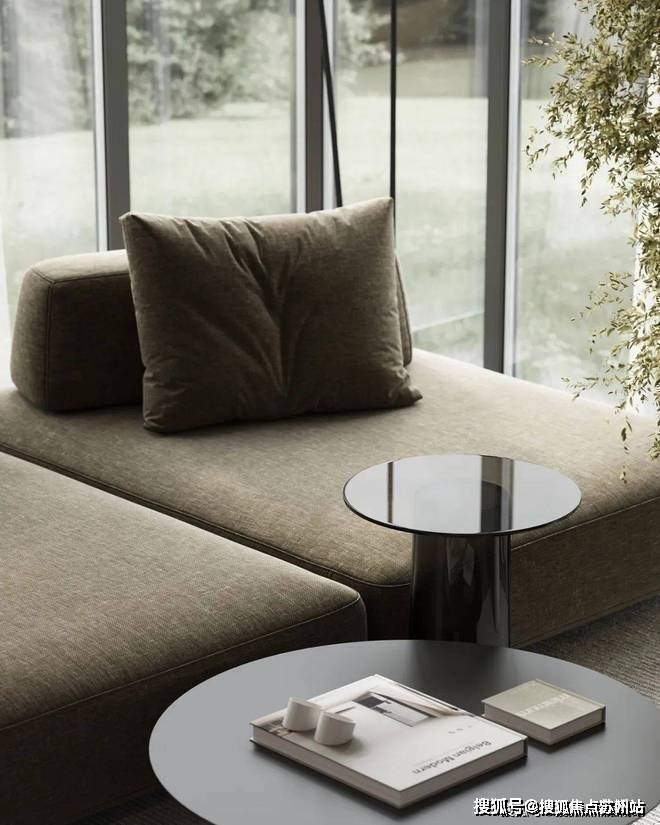 苏州上华璟庭售楼处电话☎:400-8118-224(售楼处预约看房热线)客厅中,设计师选用暖灰色作为空间的主色调,搭配上原木色的地板,奠定现代极简的空间基调.灰绿色的布艺沙发搭配上圆形的小茶几,展现出空间的几何美感.沙发旁摆放着绿植,为室内空间增添了一抹色彩,呈现出现代空间的生活美学.