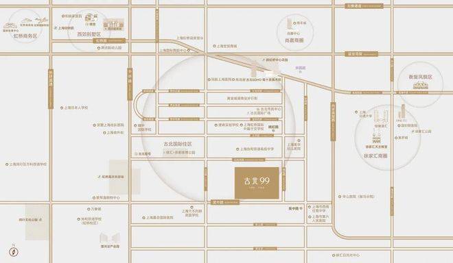 1-1.5公里步行圈:古北1699广场、黄金城道步行街、高岛屋、古北市民中心、体汇+名都体育公园、虹桥高尔夫球场、古北SOHO、程十发美术馆;2.5-3.5公里生活/商务圈:尚嘉中心、南丰城、老外街、世贸商城、徐家汇恒隆、新鸿基ITC、爱琴海购物中心、万象城、仙霞网球中心、西郊宾馆、虹桥迎宾馆、漕河泾开发区;