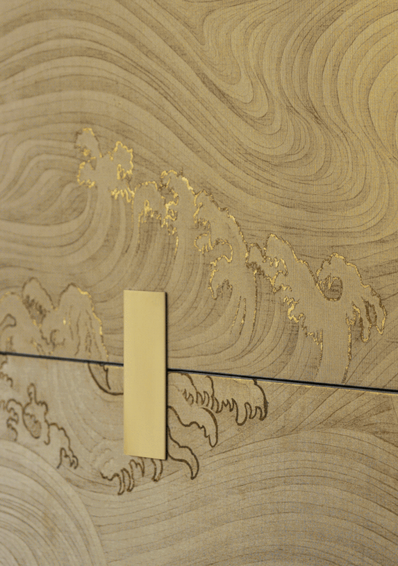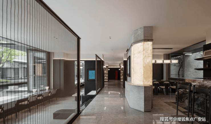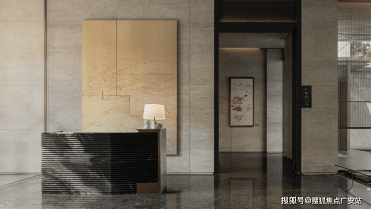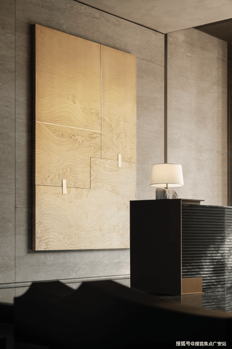 选用黑山石、梵高印象等名贵的石材,于空间内部营造出山水画卷般的意蕴。两侧的接待台处,艺术家运用细腻的白描浪花笔触,将湖景的灵动瞬间定格。