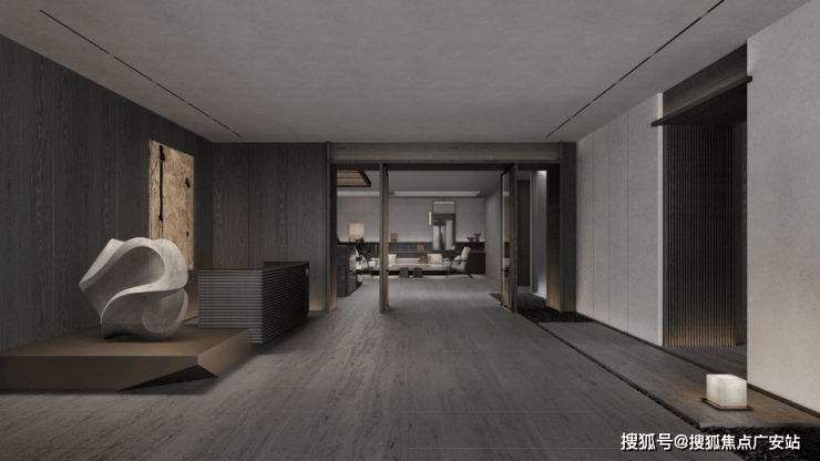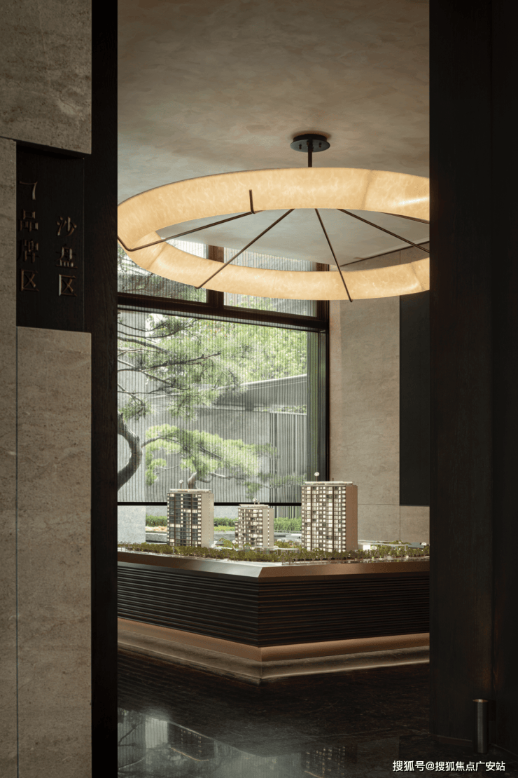 顺着水流声的方向移步至沙盘区,精心雕琢而成的玉环悬浮在沙盘的上空,呼应着东方天圆地方的空间哲学。