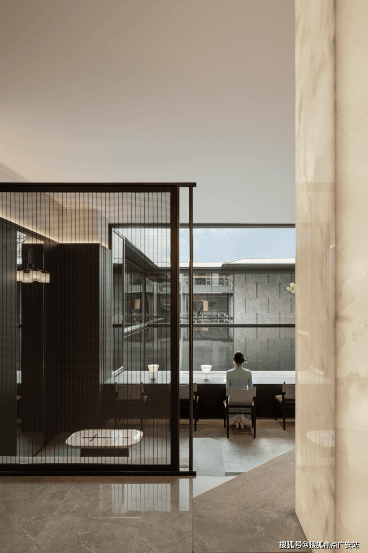 在水景窗前,山水装置凭借现代手法使复杂的东方意象具备了更为简洁的呈现形式。凝练苏式建筑屋檐的线条与体块,采用“立体构成主义”的方式编排出抽象的雕塑装置,再辅以悠悠的水景,为这座微缩的城景注入了苏式的灵魂。