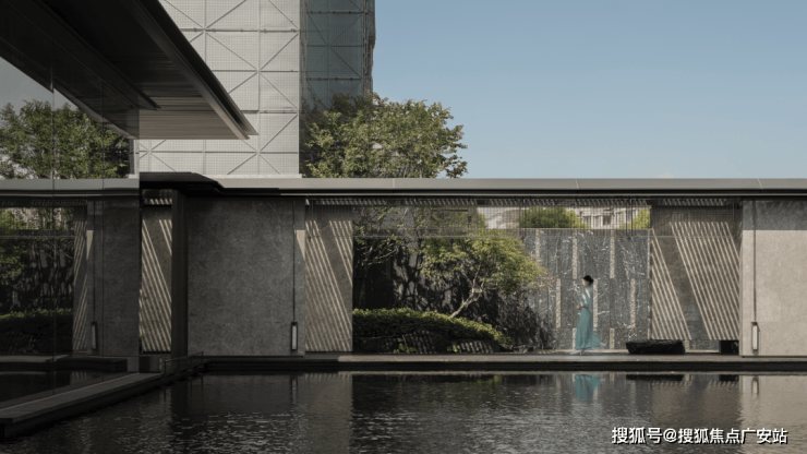 各个空间与中央的景观水院通过长廊相互衔接,隐约显现区隔,阡陌纵横通达,同享一片水院,又相互独立,拥有截然不同的景致体验,游园的氛围就这样慢慢荡漾开来。