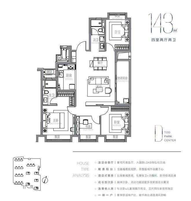 建面约143㎡户型则是项目此次的明星户型,也是市场臻稀的终极改善产品,四房的功能性匹配愈来愈多的二胎和三代同堂家庭。格局上做到了南北通透+三开间朝南,采光和通透性俱佳!