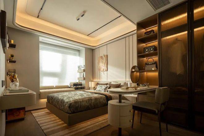 比如说,圆弧形吊顶让空间更具柔和美感,金属线条提升空间的层次感,细节之处精致考究。
