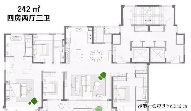 该户型同样为四房两厅三卫,建面约240㎡户型的缩小版。