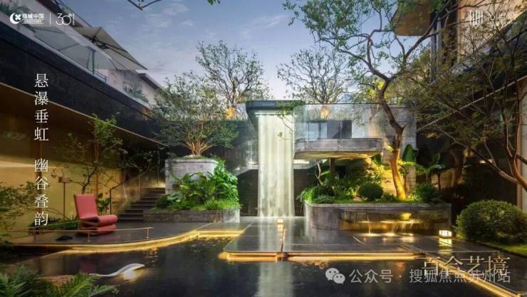 悬挑的飞瀑串联着地面和下沉空间 ,另外还搭配了阶梯式绿化、镜面树池错层平台,空间感很强。