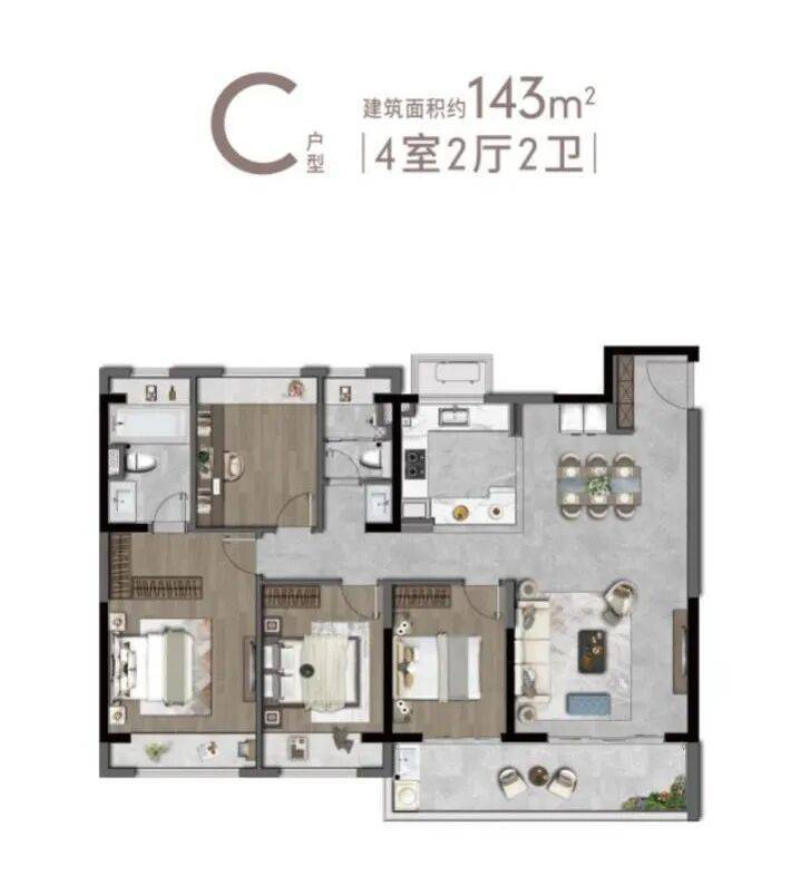 以建面约143㎡四房为例,四开间朝南,延展房子的阳光面,双联阳台,提升了户型的通透性,全屋飘窗,扩大了空间,提高了居住舒适度。