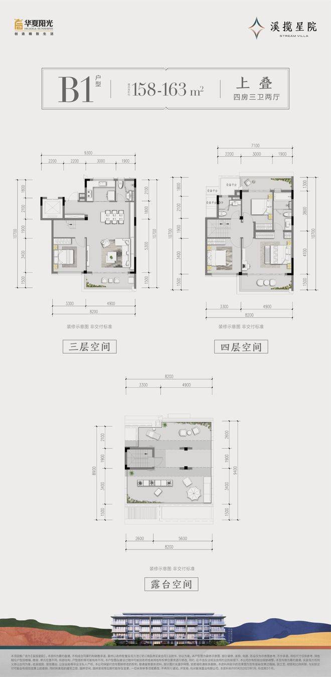 溪揽星院主力户型为A户型建筑面积约142-148㎡、B户型建筑面积158-163㎡、C户型建筑面积182-186㎡,均为上下双叠格局,每一层都拥有独立的世界。