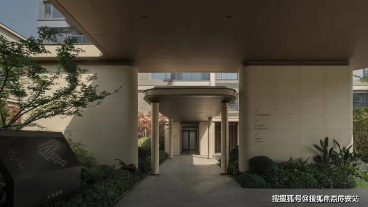 社区入口设计以“隐奢”为核心理念,摒弃传统豪宅项目的张扬符号,转而通过材质、比例与空间叙事的精准把控,传递低调中的精致感。主入口并未采用高耸的门楼或繁复的装饰,而是以米黄色石材与香槟金色金属格栅的组合,构建出克制而优雅的视觉语言。