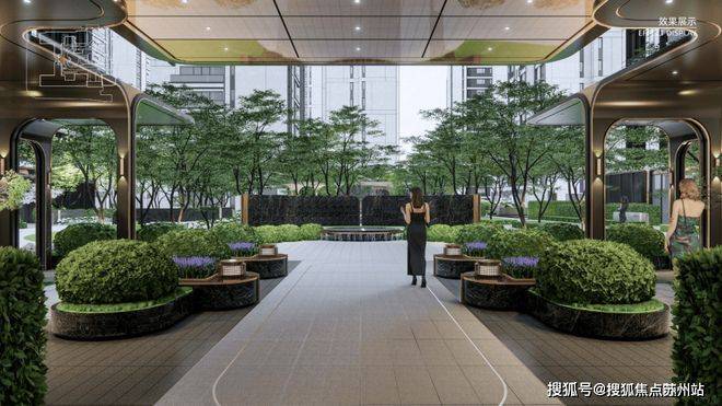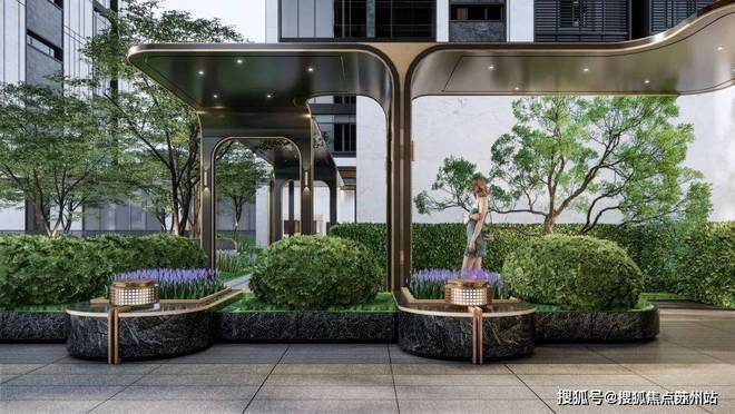 比如“原生围合社区”、风雨连廊,从高奢酒店中获得灵感的酒店式落客区、度假风园林,以及千万级住宅中都不多见的下沉式会所!
