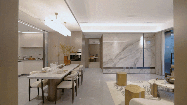 迈入客餐厅,气派方厅设计,衔接瞰景阳台足以摆得下承载八人的餐桌,彰显大家风范。