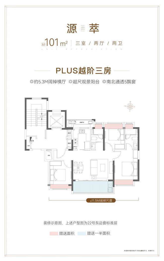 建面约101㎡3房2卫户型,非常标准的飞机户型。