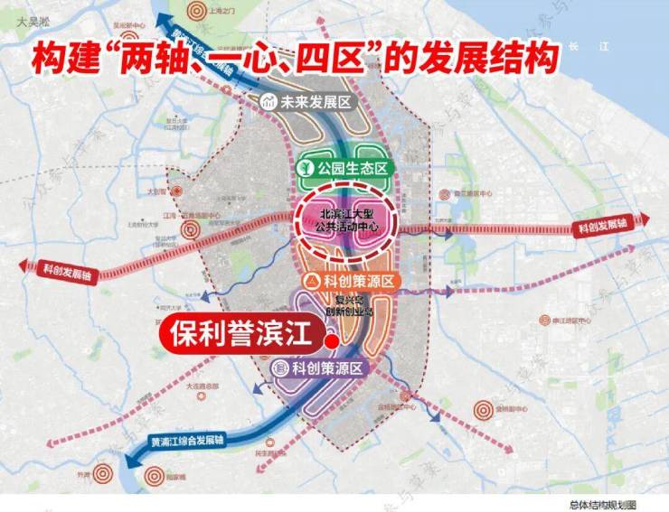 如下图,其中“一心”是黄浦江沿岸综合发展轴和翔殷路-五洲大道科创发展轴交汇处,未来会有大型体育文化场馆、滨水公共活动中心等。保利誉滨江离“心”很近。