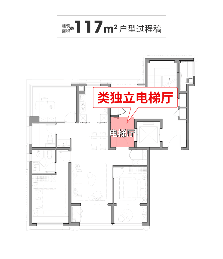 项目所有户型都拥有“类独立电梯厅”或者独立电梯厅,入户私密性拉满的同时也增加使用空间。