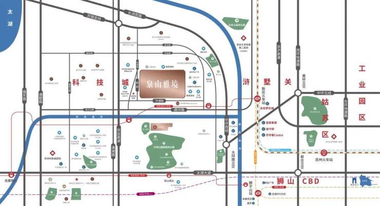 项目东枕京杭运河,南望苏州“城市绿肺”——大阳山国家森林公园、树山生态公园,远眺浒光运河,北邻景观河道与公园,山水环伺,生态宜居。