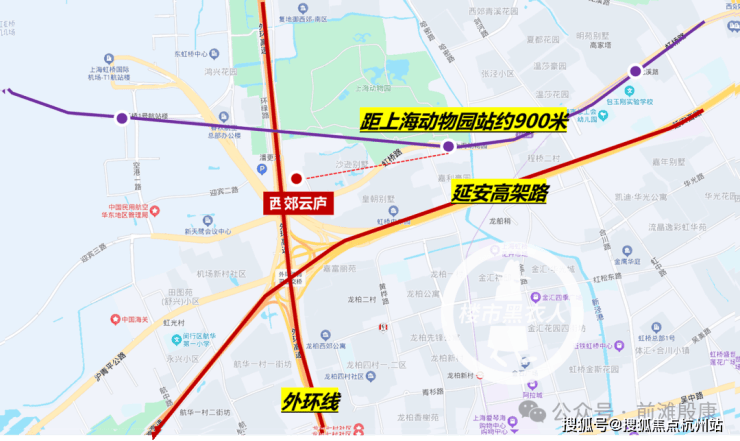 交通方面,直线距地铁10号线上海动物园站约900米,可快速直达虹桥枢纽。自驾的话,项目本身就在延安高架、外环高架围合之内,交通便利,通达全城。
