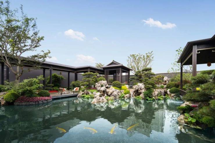 走在溪映听庐实景呈现的新中式园林景观,滨江御用的贝尔高林团队,以《兰亭集序》为主题,鸾山、叠水、庭院、园林……一步一景,描绘出一卷淡彩水墨的宋韵景色。