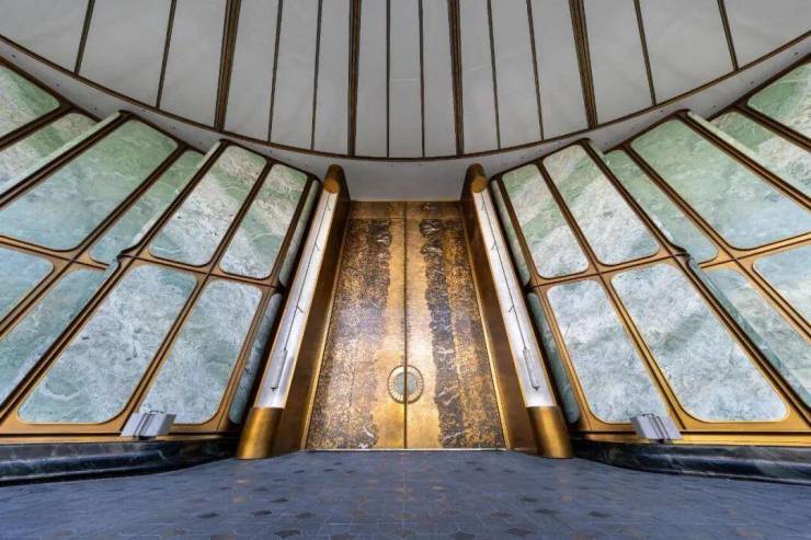 比如约56x11.5米的超尺度门庭,顶部以杭州折扇为造型灵感,寓意“藏风聚气”;四周还有12片巴西进口的百达翡绿奢石雕琢的玉石屏风;中间还有约9.6x5.3米的巨幅铜门,是由非遗传承人朱炳仁手工锻打,再现钱塘潮涌的磅礴气场。