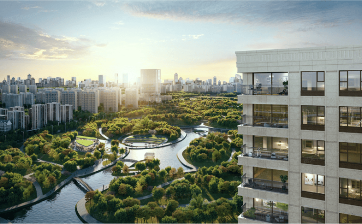 项目西侧紧邻百万方中央公园浩瀚森境,打造约200米景观面,营造出门即公园、进门即私园的独特感受。