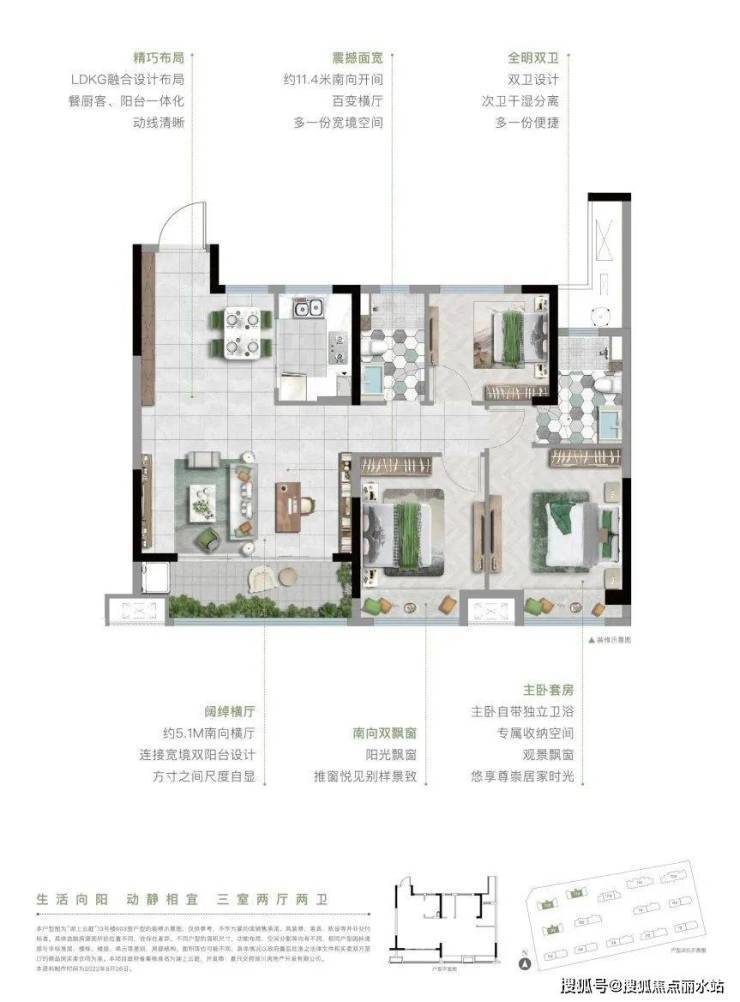 双卧室阳光飘窗,除了给足阳光外,更增加了空间的延展性,不论是于此赏景看书,还是下棋对弈,都不失为一个好的选择;双卫浴带给生活的便利不用细说,三室两厅两卫的格局为每个家庭成员预留了专属空间。