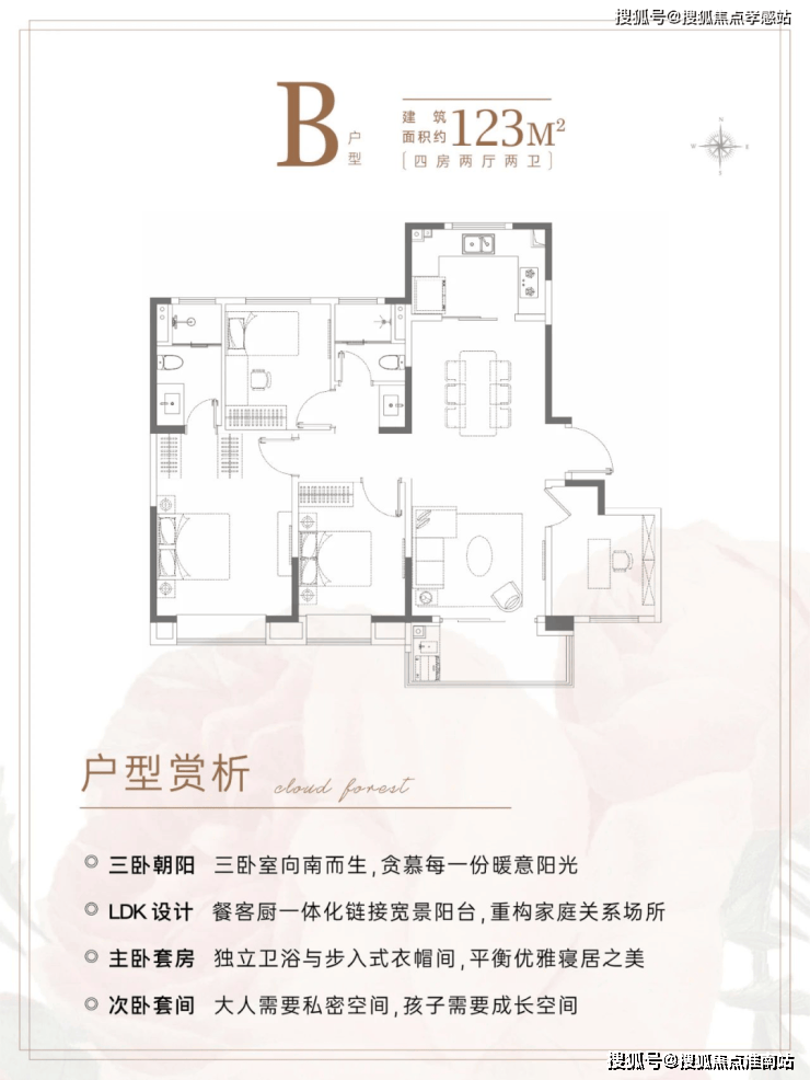 在当下100㎡及以下面积段占绝大多数的情况下,建面约123㎡4房本就十分稀缺。而在产品设计上更加符合全龄段各种家庭结构的居住需求。