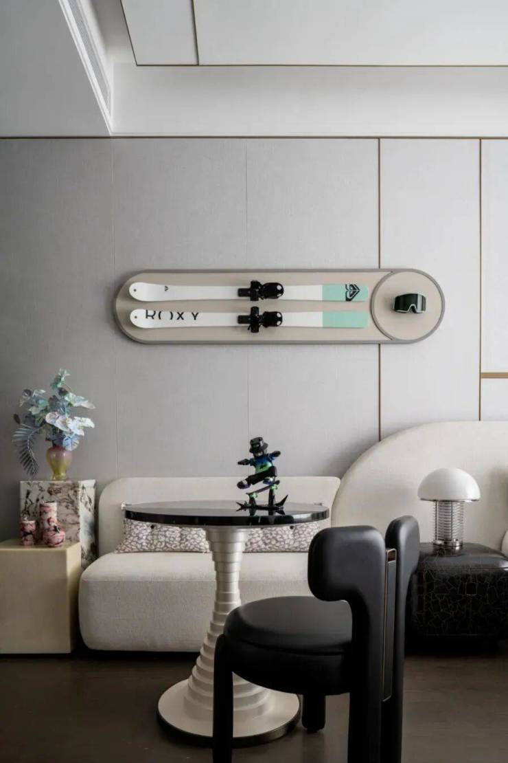 展示空间中的软装极富艺术趣味,比如青铜雕塑《我心飞翔》、玄关油画《飞翔的羽毛》、野崎信次郎《彩の花束》,大师们的真迹为空间注入高雅艺术底蕴,而儿童房的Qeeboo兔子椅则匹配孩童特性充满童趣。