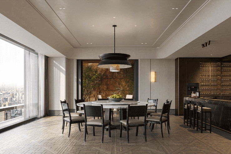 约2600平双首层地下会所仅向小区业主开放,配置25*11m半标恒温泳池,泳池配4条泳道,可满足健身、娱乐双重需求;约180平㎡私宴厅,酒窖、会客厅及健身房。围合式下沉庭院通过大面积超白玻璃,巧妙的将庭院自然景观过渡到室内,使得室内和室外景观“内外合一”。